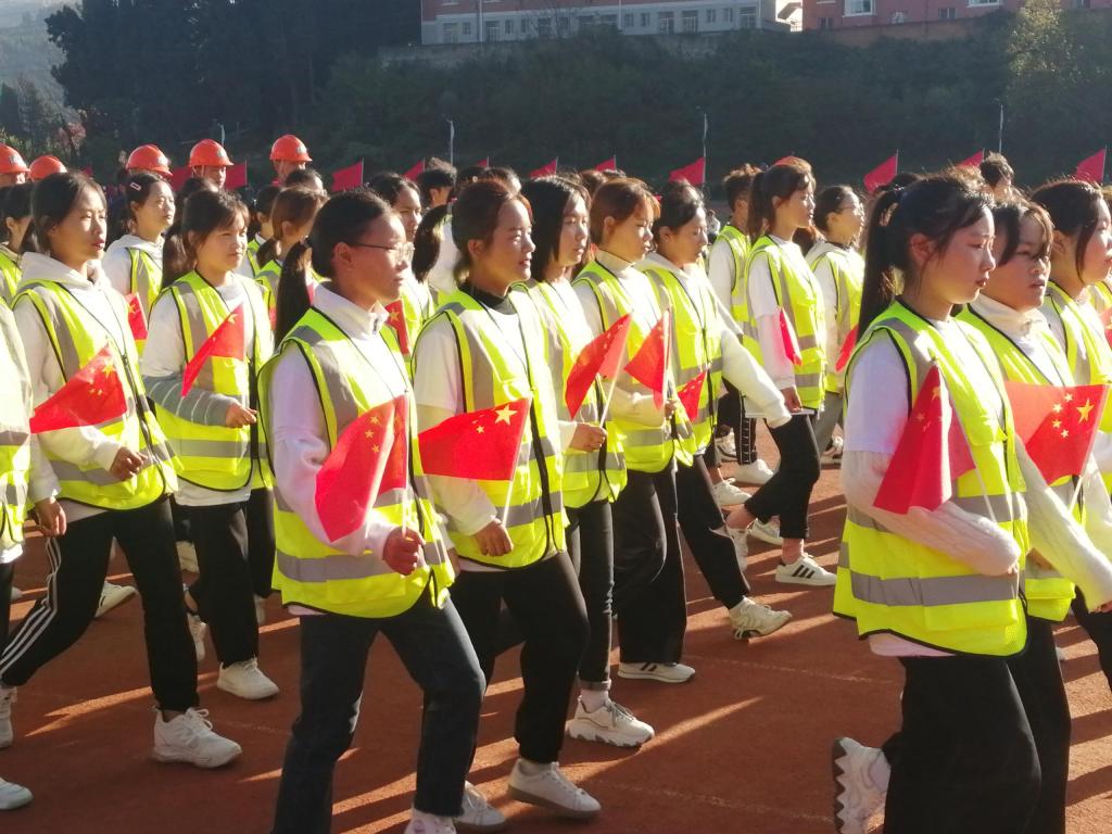 热闹新颖的入场式,是广大师生们早早准备的成果。解说员宣布标兵就位,国旗护卫队、校旗队、红旗方队、四家二级学院代表队、广播体操展演方队依次入场。