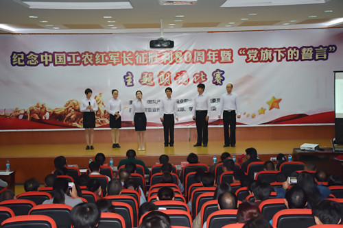 为隆重纪念中国工农红军长征胜利80周年,讴歌中国共产党为实现中华民族伟大复兴中国梦的奋斗历程和光辉业绩,充分展示职业学院广大教职员工立德树人、追求卓越、勇攀高峰的良好精神风貌。11月16日晚19:30分,由职业学院党委主办,党委宣传部、思政部、学生处和团委承办的纪念中国工农红军长征胜利80周年暨“党旗下的誓言”主题朗诵比赛在508报告厅举行。学院领导班子、助理以上管理干部、各党支部全体党员以及200多名学生观看了比赛。