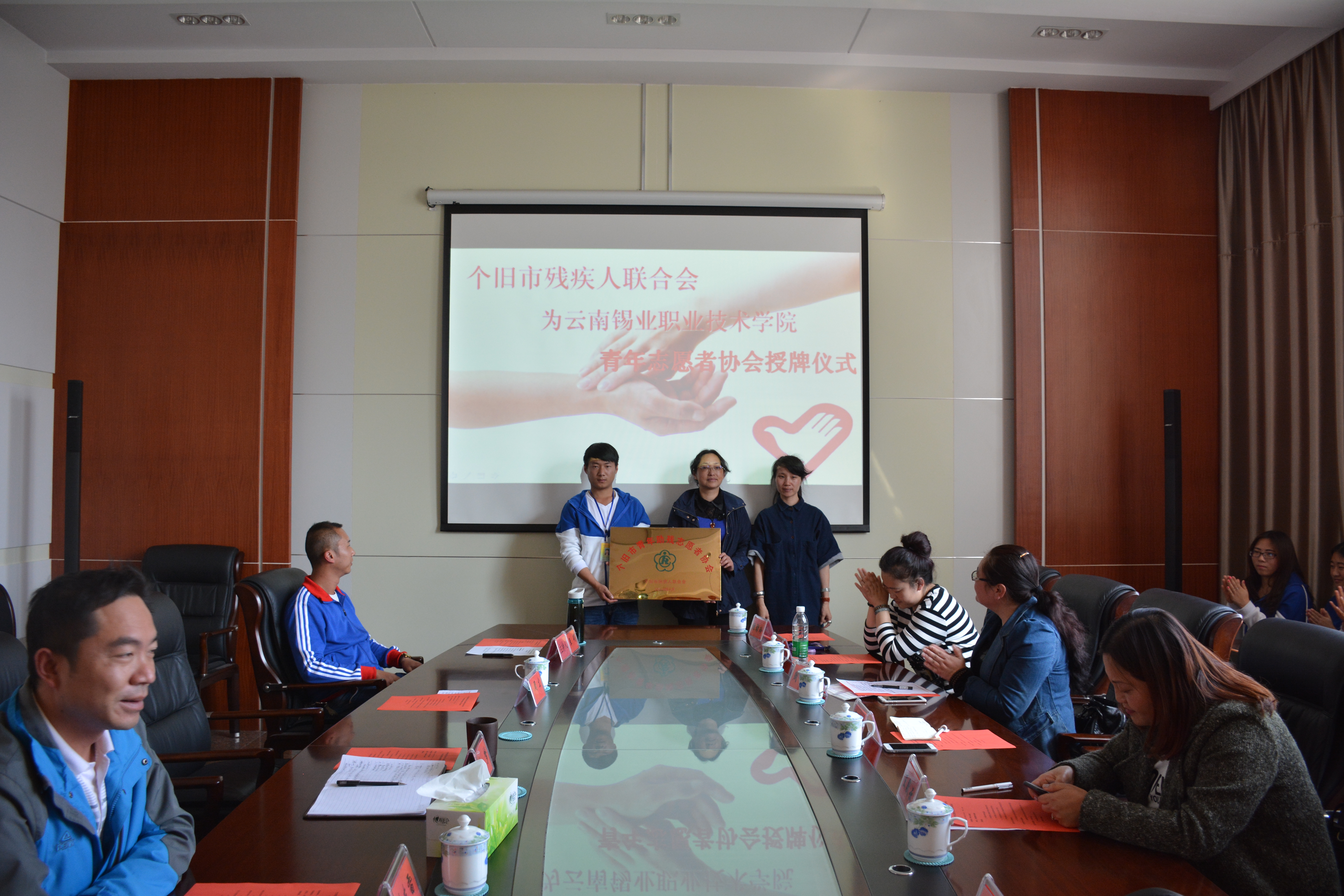 最后,个旧市残疾人联合会副理事长孙娅代表市残联向职业学院青年志愿者协会授牌,金湖南社区向青年志愿者协会赠送了2台电脑。