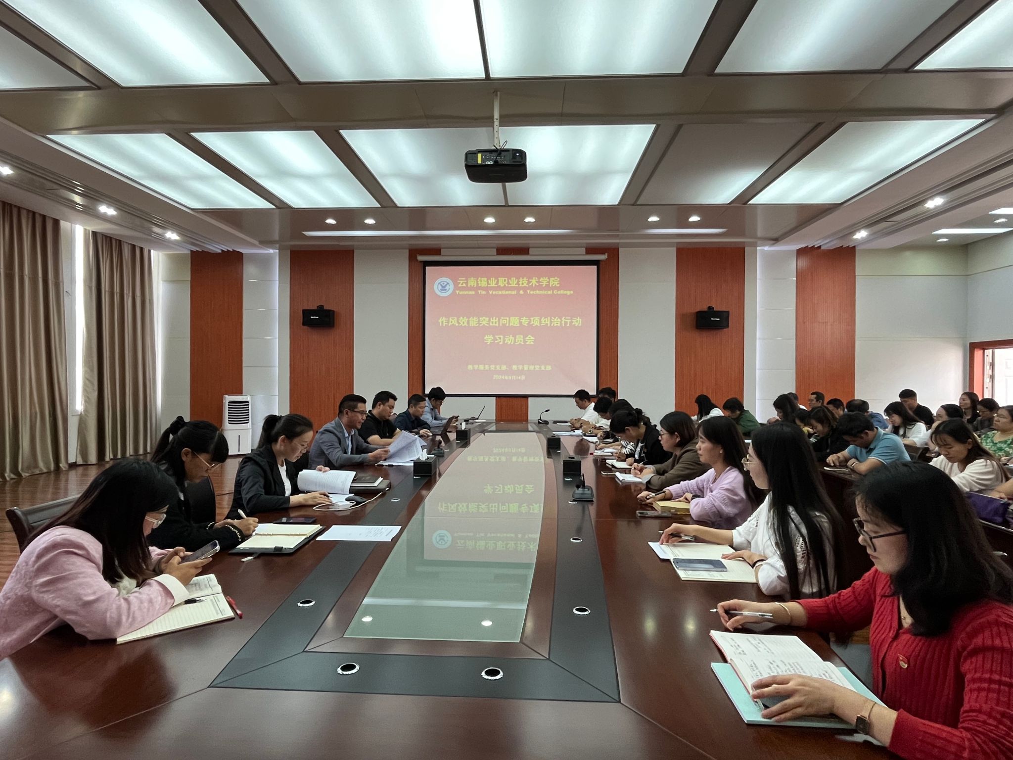 学院深入贯彻落实习近平总书记关于作风建设的重要论述,深入开展作风革命效能革命,树牢“十种鲜明导向”,落实省委教育工委、省教育厅印发的推进作风革命加强机关效能建设20条措施要求,以推进控股公司党委巡察反馈问题整改、教育教学高质量发展三年行动和大屯产业学院建设等重点工作任务为契机,进一步强化干部队伍建设,抓好作风效能突出问题纠治,为聚力打造锡铟全产业链高素质技术技能人才培育平台提供坚强的组织保障、作风保障、纪律保障。全面开展作风效能突出问题专项纠治行动,旨在解决学院内部存在的作风顽疾,提升教育教学效能,为师生创造更加优质的教育环境。