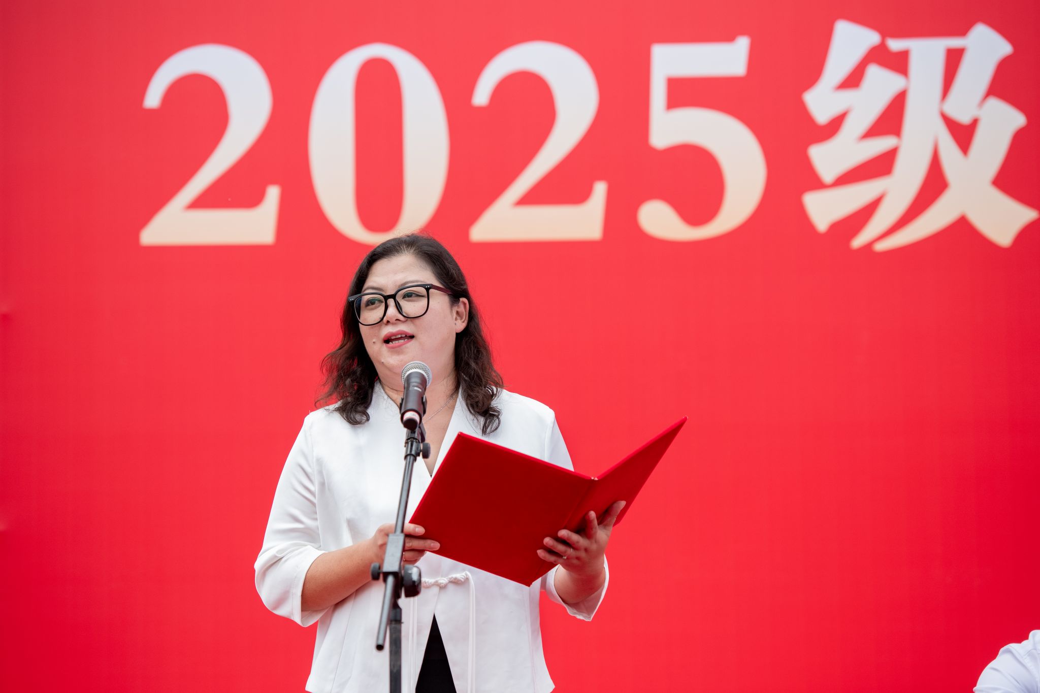 学院党委副书记、院长李蕾代表学院全体师生员工,向2025级新生致以诚挚的欢迎,并提出殷切的期望:一要坚定理想信念,心怀“国之大者”,将“青春小我”融入“时代大我”,成为“眼中有光”的追梦者;二要脚踏实地,立足当下,从小事做起,笃行实干,成为“行稳致远”的奋进者;三要锤炼过硬本领,深耕专业知识,苦练实操技能,提升综合素养,成为“肩上有责”的行家里手;四要修身立德,注重个人私德修养,学会勤俭自律,践行社会公德,懂得感恩谦让,成为“心中有德”的践行者;五要淬炼优良作风,从军训中感悟家国担当,严守纪律规定,端正训练态度,成为“身上有魂”的好青年。