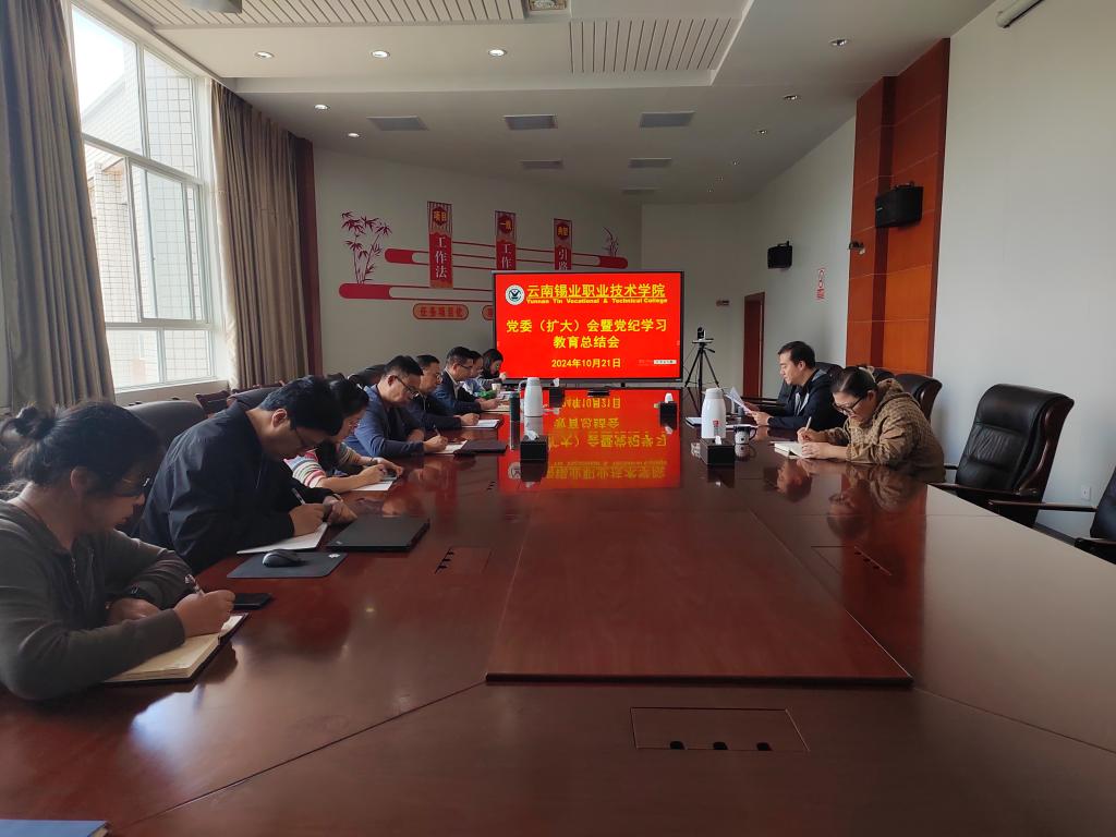 10月21日上午,学院在中会议召开党委(扩大)会暨党纪学习教育总结会,深入学习贯彻习近平总书记对党纪学习教育的重要指示以及中央、省委党的建设工作领导小组会议精神和云锡控股公司党委党纪学习教育总结会议精神,全面总结学院党纪学习教育开展情况,部署推进党纪学习教育常态化长效化工作。