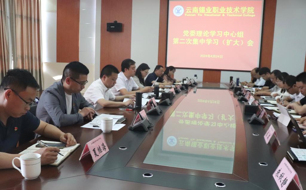 4月24日上午,学院在大会议室召开2024年党委理论学习中心组第二次集中学习(扩大)会,深刻学习领会了习近平总书记对维护社会稳定作出的重要指示批示精神、关于总体国家安全观的重要论述,持续树牢底线思维、强化风险意识,为学院聚力打造锡铟全产业链高素质技术技能人才培育平台筑牢安全屏障。