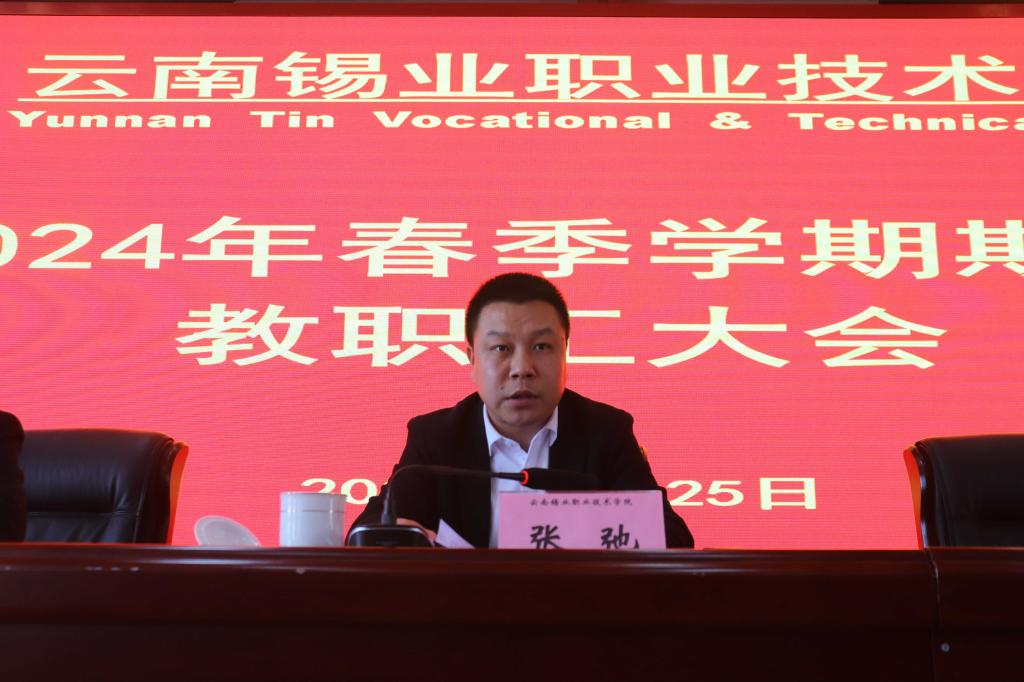 学院党委副书记、工会主席张弛就本学期整体工作进行了部署和安排并提出工作要求:一要创新驱动,持续提升教育教学质量。紧扣云锡控股公司提出的“依托云锡职业技术学院教培基地打造高技能人才培育平台”的定位,将全力推进高水平专业群“9大”建设任务,以3个省级教师教学创新团队建设为契机加强教学团队建设和管理,以云锡四大产业战略需求为引领优化专业结构设置,持续深化“双线并行,五阶递进”的人才培养模式,打造产业、企业、专业、学业、就业的“五业贯通”的专业办学格局。二要多措并举,持续改善办学基础条件。要加快推进实训室、大师工作室和教学成果展厅的建设,升级改造老旧设施设备,积极推进大屯产业学院一期项目建设。三要加强分析研判,着力推动招生就业见成效。要加大联合办学拓展力度扩规模,充分利用信息化手段提水平,任务不减、质量不降抓就业。四要提质提速,全面完成培训鉴定既定目标。要认真研究制定培训方案提高服务质量,加强内部管理体系建设实现培训管理制度化,按照“规范有序、安全稳定、质效提升”原则实现培训工作规范化、标准化,建立培训质量评估体系确保培训有源可溯。五要紧盯政策,多方争取政策资金。要充分利用高水平专业群建设项目、校企合作、科研项目申报等契机实现借力发展,充分利用培训资质和条件多类别、多等级、多频次开展职业培训并争取培训补贴。六要抓实抓细工作落实,层层压实安全环保责任。要保持高度警惕、毫不松懈的思想强风险意识,严格落实校园安全工作,做好师生安全教育和食品安全卫生整治工作,以新的实绩扎实推动学院高质量发展。