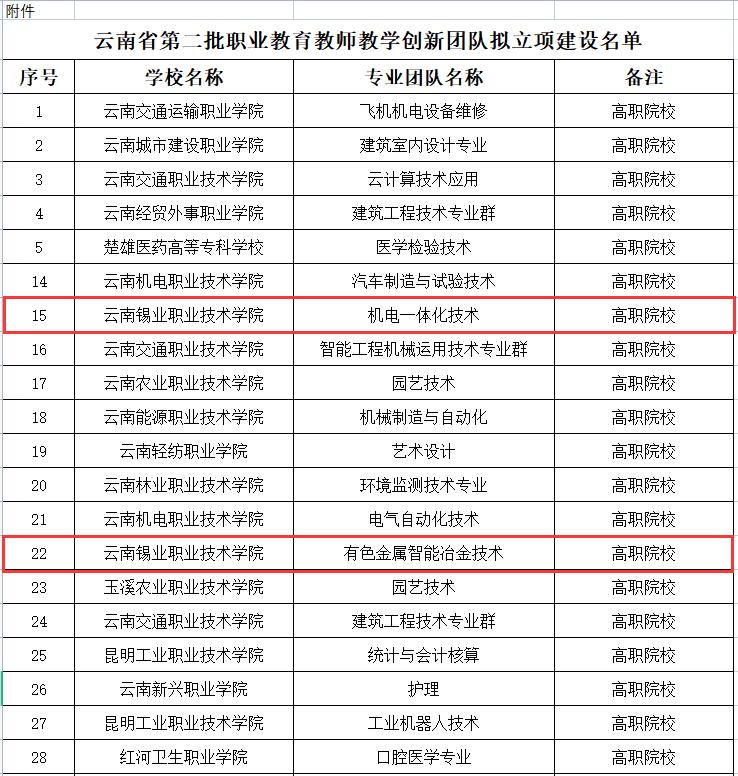 为贯彻落实《国家职业教育改革实施方案》和《职业教育提质培优行动计划(2020-2023年)》,近日,云南省教育厅发布了《关于云南省第二批职业教育教师教学创新团队拟立项建设名单的公示》,经院校自主申报、省教育厅形式审查、专家评审,学院有色金属智能冶金技术、机电一体化技术两个专业团队成功入选省级教师教学创新团队。