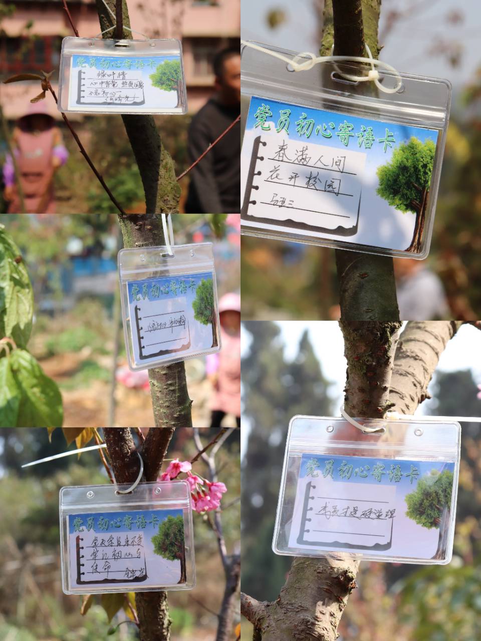 在现场,学院党委精心准备了“党员初心寄语卡”,参加活动的党员写下寄语并签名,随后把“党员初心寄语卡”悬挂在自己种植的树苗上,勉励自己的入党初心与树苗一同茁壮成长,时刻“不忘初心、牢记使命、恪尽职守、勤勉工作”。