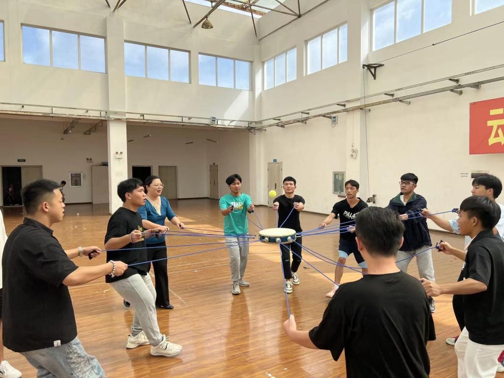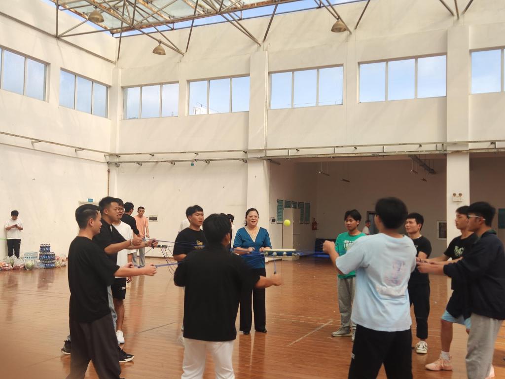 李蕾来到学生活动中心四楼,见到同学们正在默契地开展同心鼓破冰游戏活动,便兴致盎然地参与到了同学们的活动中,鼓励同学们默契同心,“鼓”动精彩。
