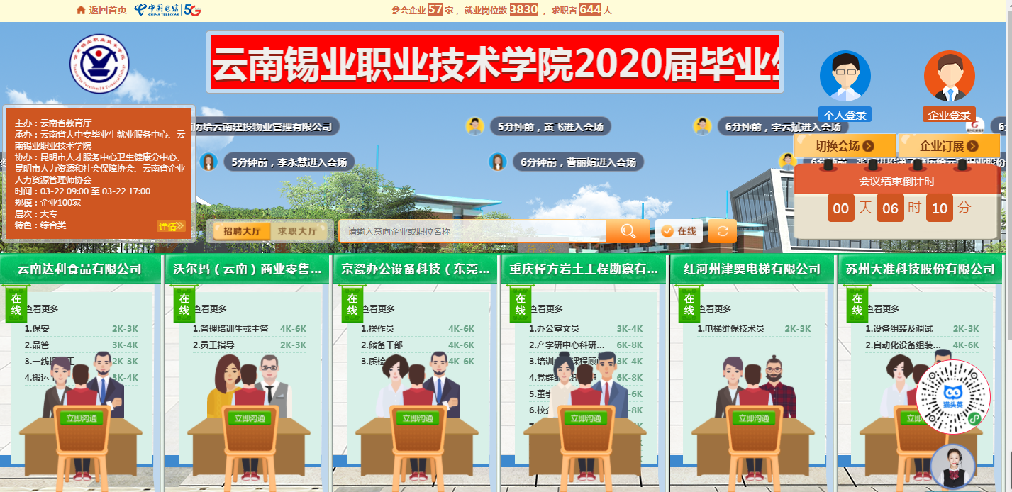 3月22日,学院通云南省教育厅搭建的网络招聘平台举办了“今年会官方网站2020届毕业生春季首场网络视频招聘会”,此次招聘会由云南省教育厅主办,今年会官方网站、云南省大中专毕业生就业服务中心承办。