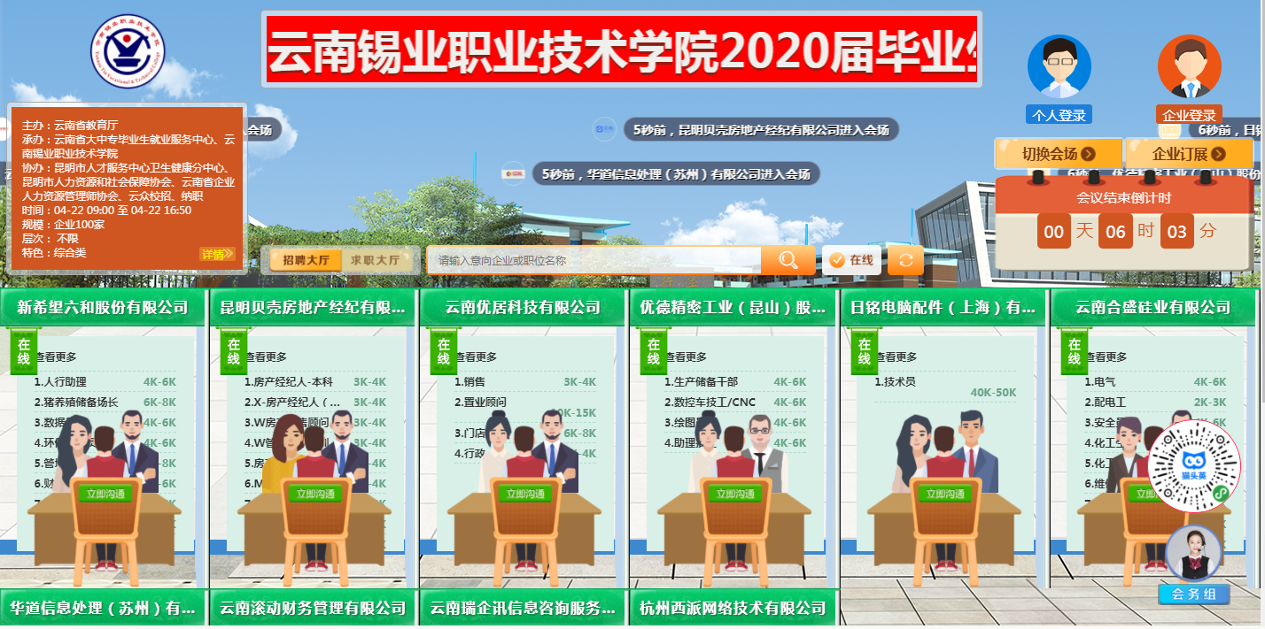 学院加强与云南省大中专毕业生就业服务中心沟通,确定4月22日通过云南省教育厅搭建的网络招聘平台举办今年会官方网站第二场网络视频招聘会,此次招聘会由云南省教育厅主办,今年会官方网站、云南省大中专毕业生就业服务中心承办。