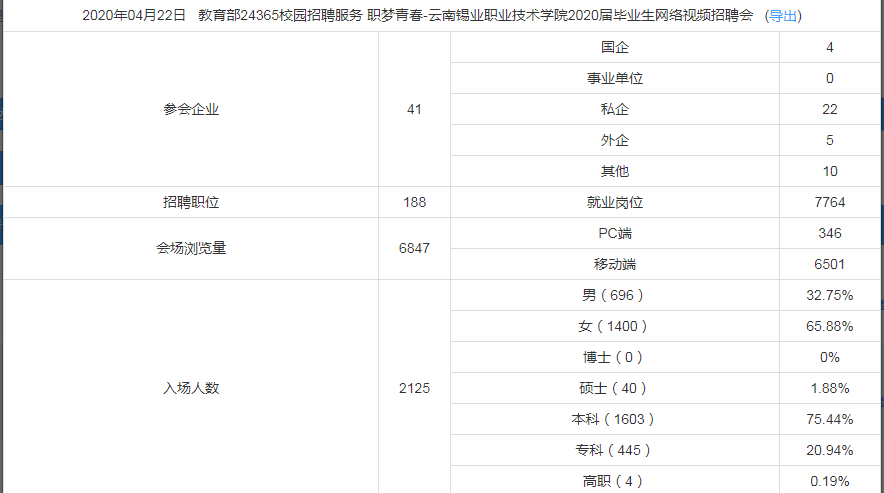 为保证本次网络视频招聘会顺利举行,学院领导、招生就业处、信息中心高度重视毕业生就业工作。在认真总结上一场网络招聘会存在问题和不足的基础上,加大前期的宣传工作,会前以推文链接二维码方式,通过企业微信、QQ等方式多方面动员毕业生参加双选会。经多方努力,本次招聘会共有来自北京、上海、广东、江苏、浙江、天津、四川、重庆、贵州、云南等9个省市的41家用人单位参加,涵盖了教育、制造、金融和技术服务业等10个行业领域,发布职位188个,人才招聘需求7764余人,全天共有2125名毕业生报名参与,学院应届毕业生报名参加人数为601人。