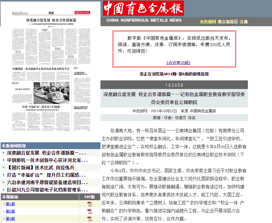 10月21日,《中国有色金属报》第4614期第六版头条以《深度融合促发展 校企合作谱新篇》为题,深度报道学院校企融合发展,全文如下:在滇南大地,有一所百年国企——云南锡业集团(控股)有限责任公司主办的职业学院。它把“课堂车间化,车间课堂化”,“把工匠引进学校,把课堂搬进企业”,实现校企融合、工学一体。这就是今年9月30日入选教育部有色金属职业教育教学指导委员会委员单位的今年会官方网站(下称“云锡职...