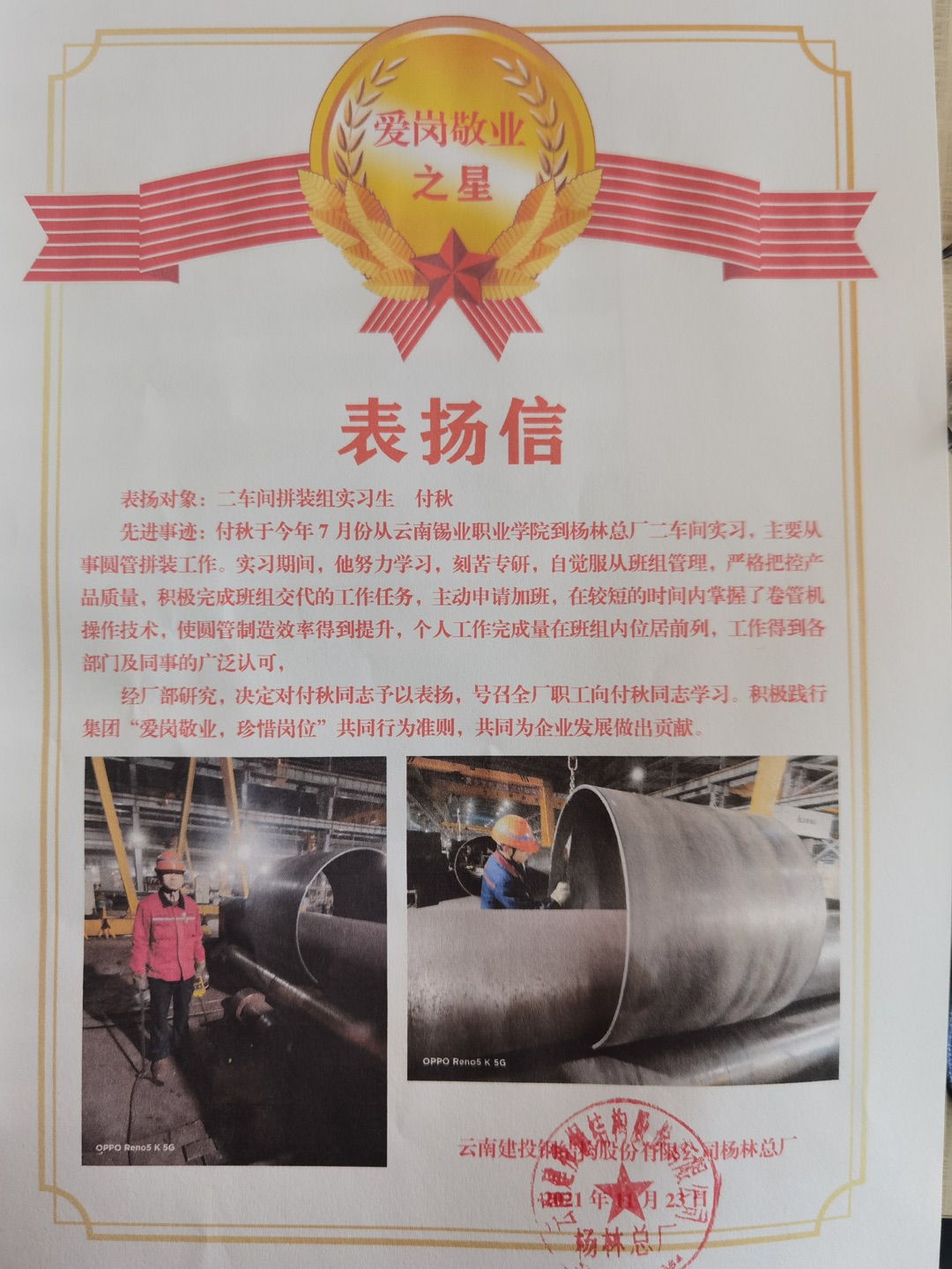 11月23日,学院19级建筑工程技术班学生付秋在云南建投钢结构股份有限公司杨林总厂实习期间,因爱岗敬业、工作出色,被评为“爱岗敬业之星”并受到企业公开表扬。2021年7月10日,付秋来到云南建投钢结构股份有限公司杨林总厂进行实习工作,开始了新的人生之旅。在进行安全培训之后,被分配到了拼装组承担钢结构最为重要且危险的一道工序进行实习。在师傅的认真带领下,付秋认真学习,积极工作。在企业生产滇中引水工程水管工作中...