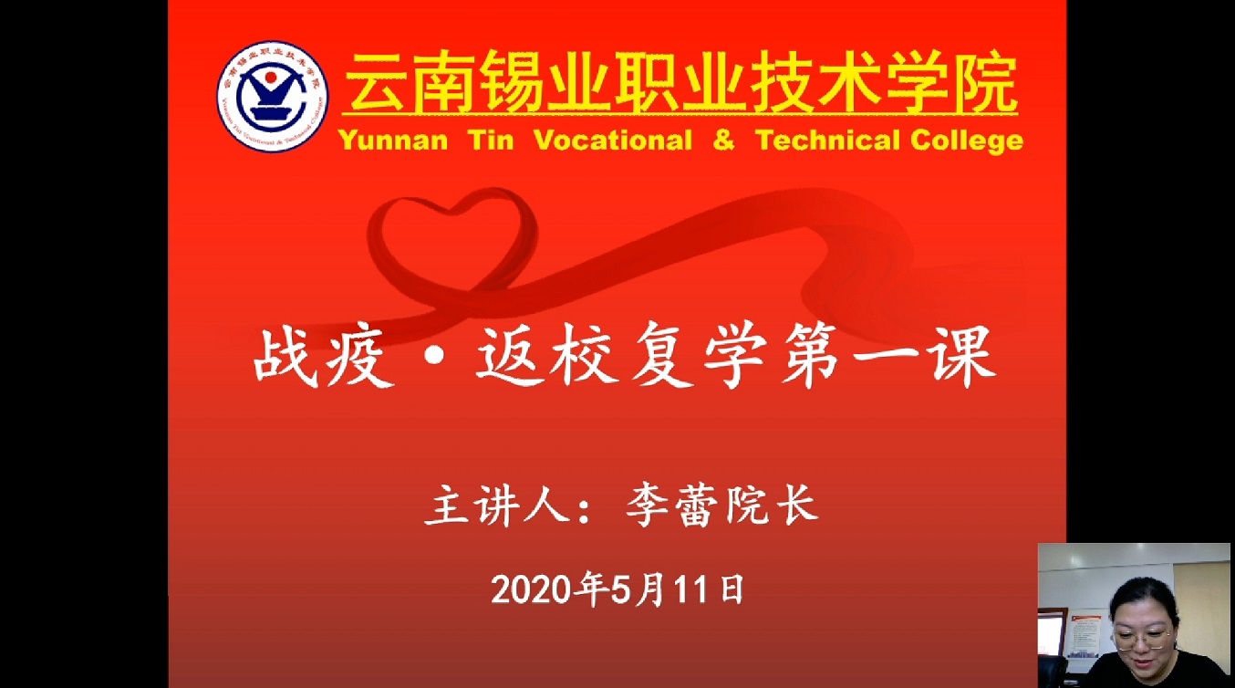 5月11日,学院院长李蕾以《战疫·返校》为题,通过在线教学的方式为全院师生讲授开学第一课。副院长陈国华在线讲授了返校前准备工作、返校途中个人防护、返校报到流程、返校后日常管理及防护等工作安排,副院长张惠芬在线讲授了返校开学教学工作实施方案。经个旧市联合检查组开学评估检查及省教育厅专家审核出具全省学校开学报备方案审核意见,学院拟定于5月16日至17日两天开学返校,复学后将进行为期一周左右的“开学第一课”系...