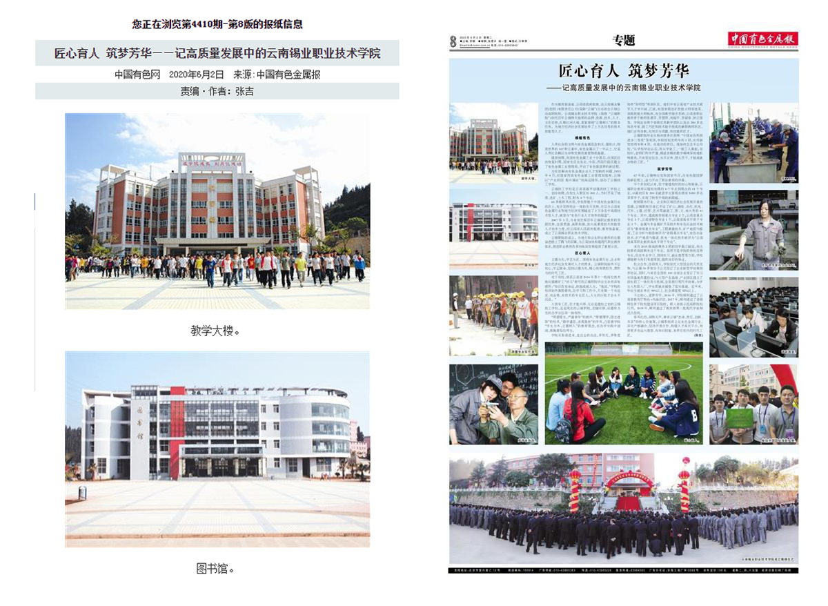 6月2日,《中国有色金属报》第4410期第8版以《匠心育人 筑梦芳华——记高质量发展中的今年会官方网站》为题,用整个版面专题报道了学院办学发展情况。地址:https://paper.cnmn.com.cn/index.aspx?v=8&q=441