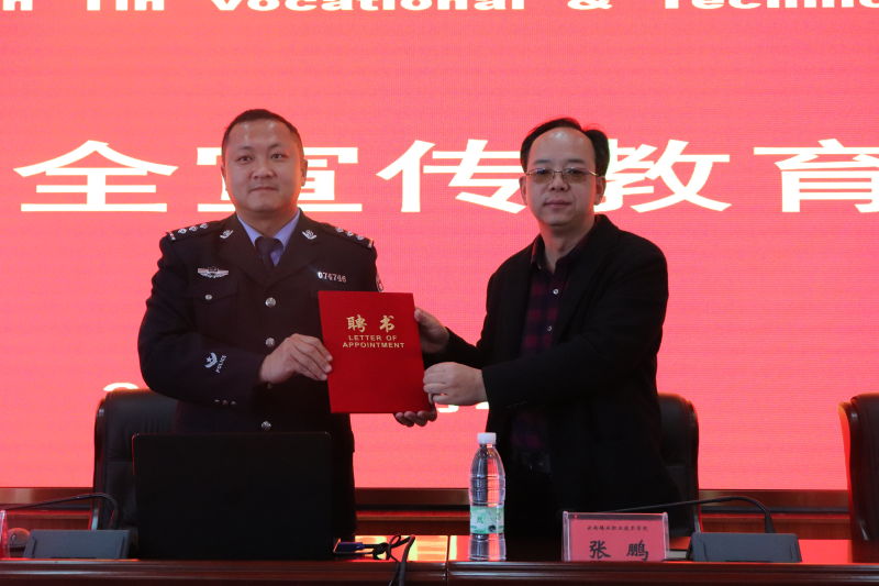 为增强同学们的安全意识,普及安全防范知识,提高自我保护能力,3月23日下午,学院联合个旧市公安局建设路派出所,在3号教学楼508报告厅举行了校园安全宣传教育活动。活动开始,学院党委书记张鹏向个旧市公安局建设路派出所副所长周劲荣颁发了聘任周所长为学院法制副校长的聘书。活动中,周所长针对当前大学生群体面对各类诈骗案件时普遍存在的防范意识差、辨识能力弱、应对水平低的现象开展安全教育讲座,周所长通过典型案例并...